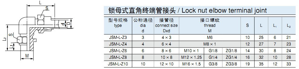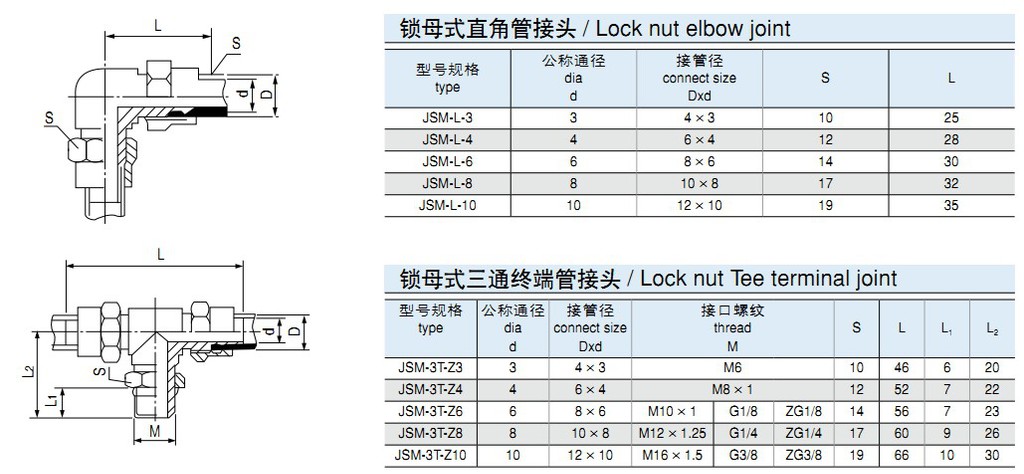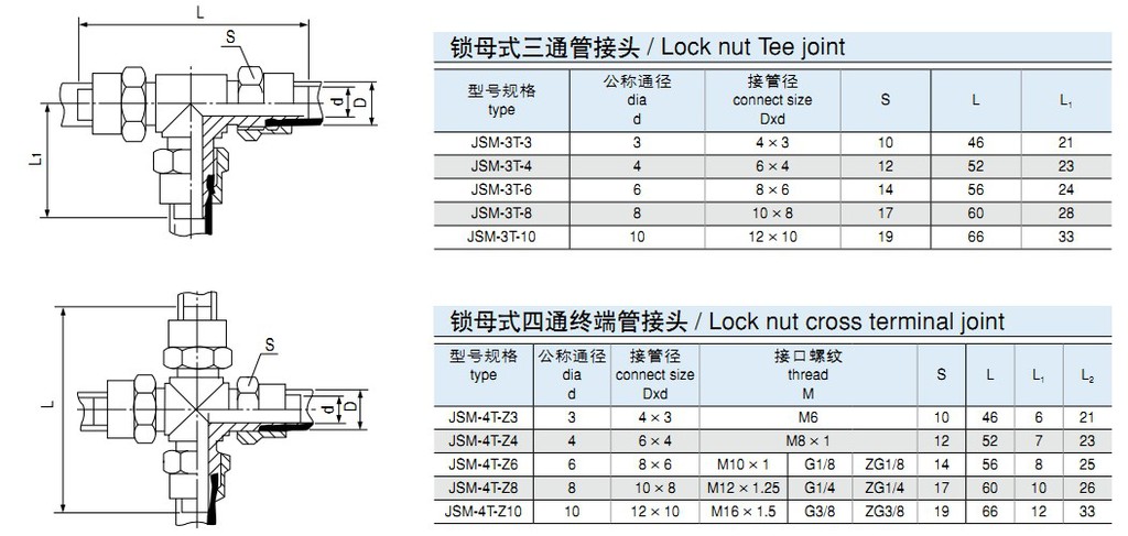 • 標記示例: ①:鎖母式三通終端管接頭 公稱通徑 Ø6MM JSM-3T-Z6 M10×1