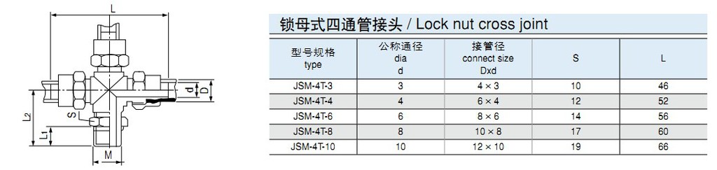一、JSM系列鎖母式管接頭,適用于連接尼龍管、塑料管,最大工作壓力為1.0MPa。該系列管接頭具有使用方便,安裝牢固等優點。