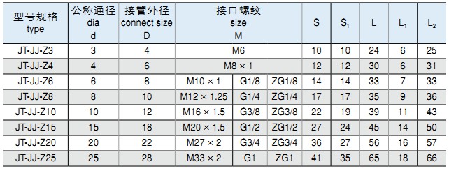 *標記示例:①:卡套式三通終端管接頭 公稱通徑 Ø6MM JT-3T-Z6 M10×1