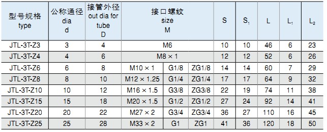 *標記示例:①:卡套式三通終端管接頭 公稱通徑Ø6MM JT-3T-Z6 M10×1