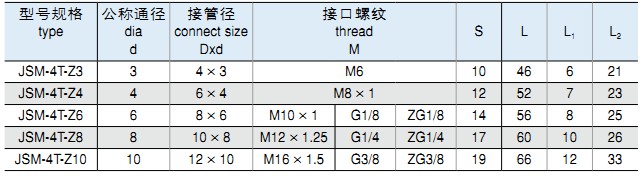 • 標記示例: ①:鎖母式三通終端管接頭 公稱通徑 Ø6MM JSM-3T-Z6 M10×1
