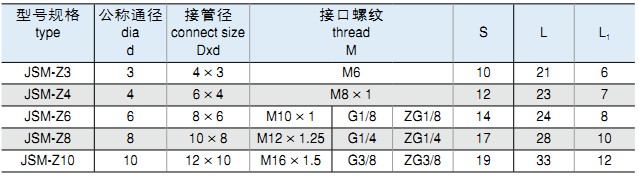 • 標記示例: ①:鎖母式三通終端管接頭 公稱通徑 Ø6MM JSM-3T-Z6 M10×1