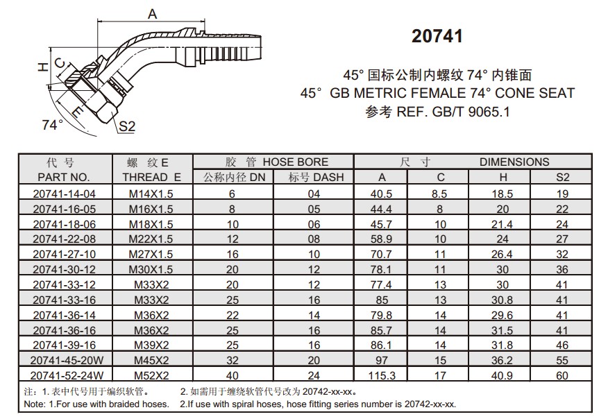 20741 45°國標公制內螺紋74°內錐面 扣壓式軟管接頭