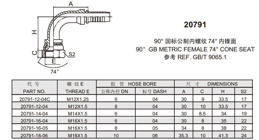 20791 90° 國(guó)標(biāo)公制內(nèi)螺紋74°內(nèi)錐面 扣壓式軟管接頭