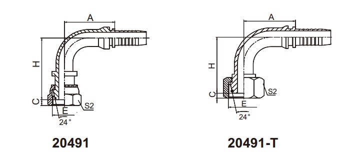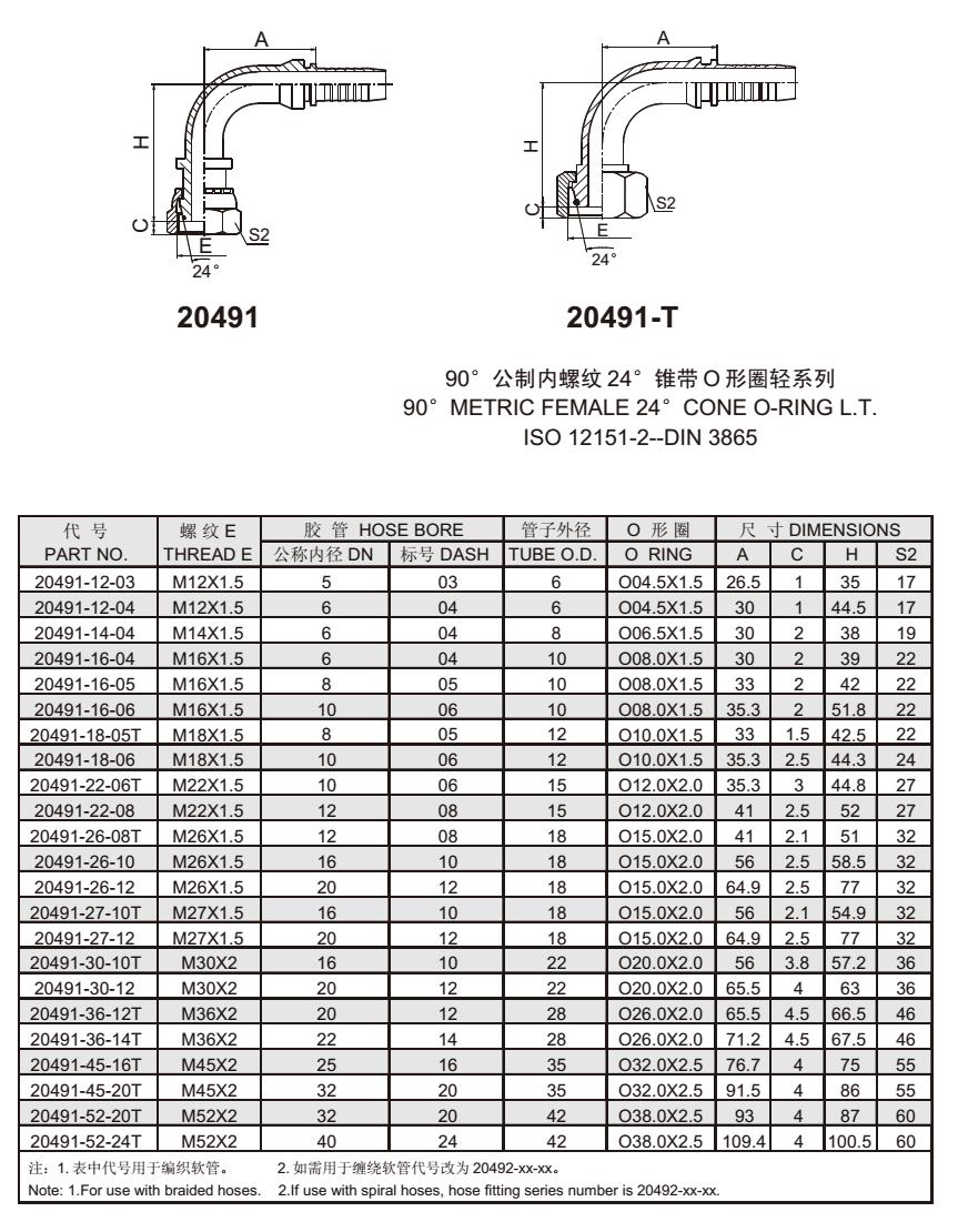 20491 90°公制內螺紋24°錐帶O形圈輕系列 扣壓式軟管接頭