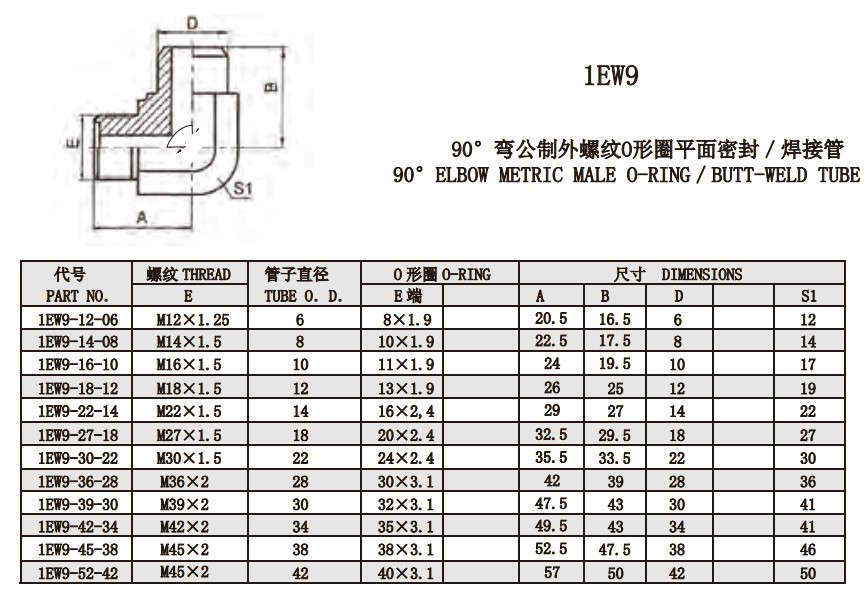 1EW9 90°彎公制外螺紋O形圈平面密封/焊接管