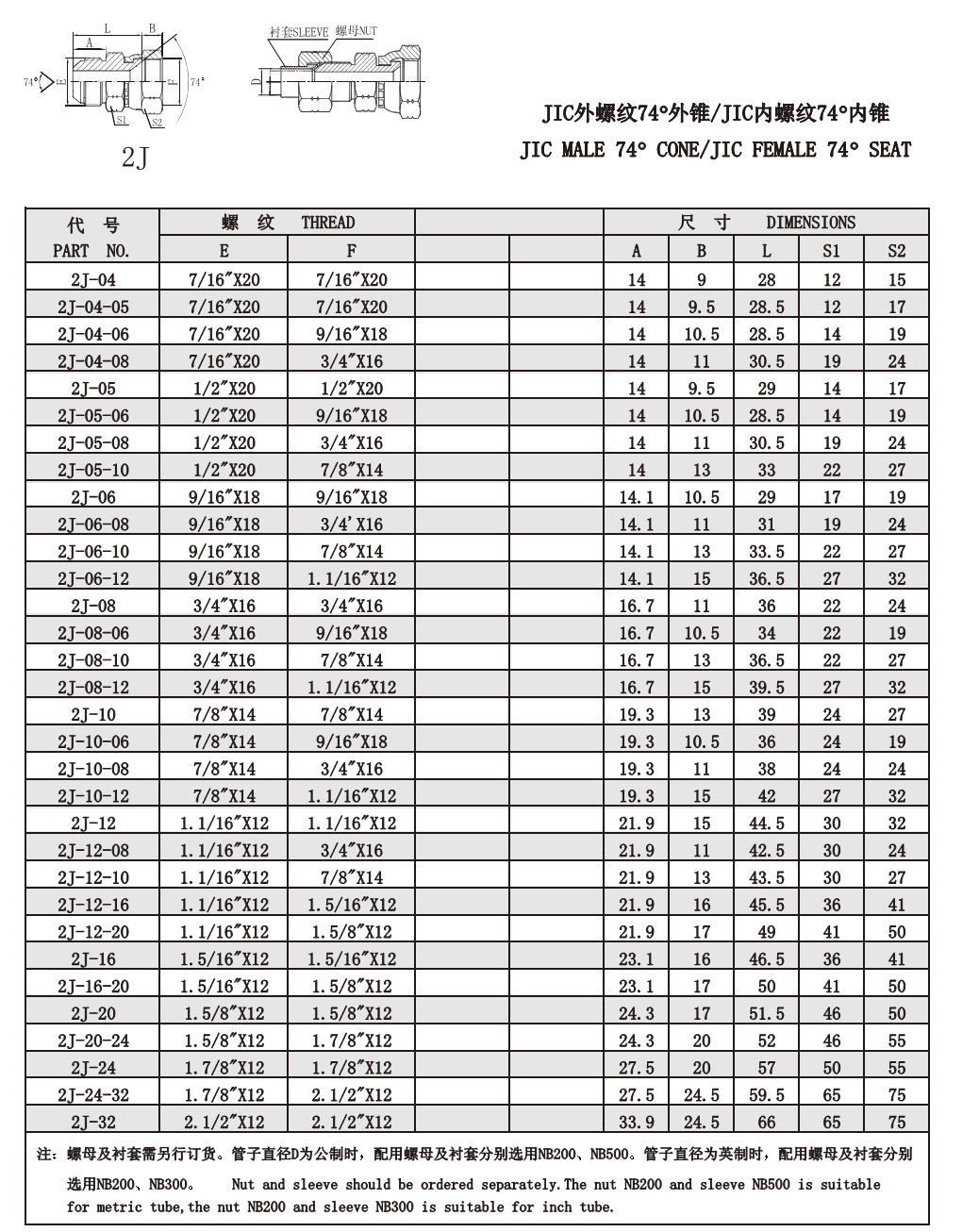 2J JIC外螺紋74°外錐/JIC內螺紋74°內錐