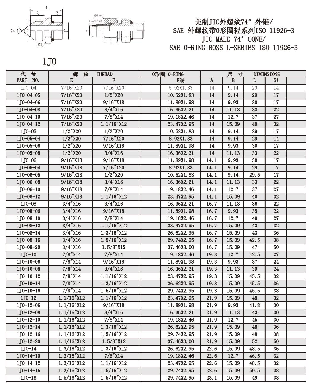 1J0 美制JIC外螺紋74°外錐/ SAE 外螺紋帶O形圈輕系列ISO 11926-3