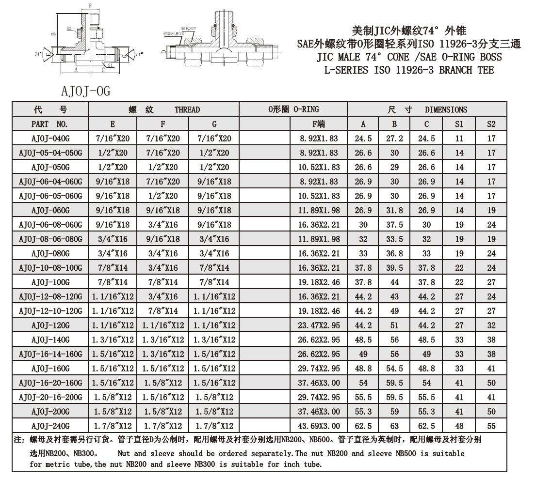 AJOJ-OG 美制JIC外螺紋74°外錐 SAE外螺紋帶O形圈輕系列ISO 11926-3分支三通
