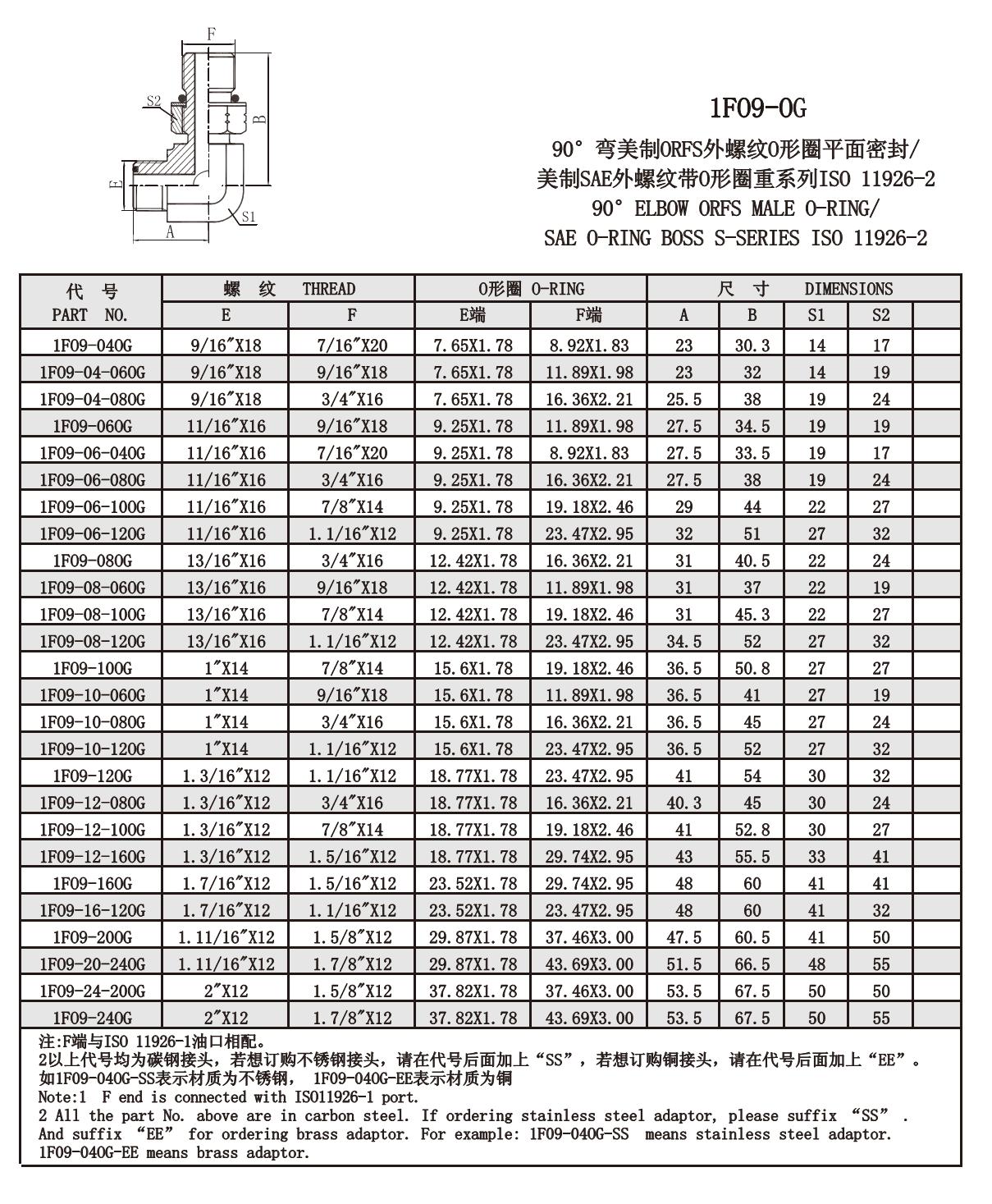 1F09-OG 90°彎美制ORFS外螺紋O形圈平面密封/ 美制SAE外螺紋帶O形圈重系列ISO 11926-2