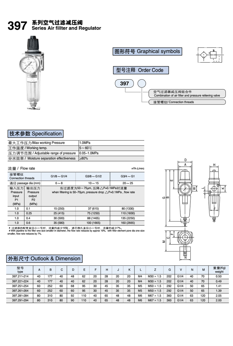 空氣過濾減壓閥397系列 技術參數1、最大工作壓力:1.0Mpa 2、工作溫度:0-50℃ 3、壓力調節范圍:0.05-1.0MPa 4、分水效率不低于80% 5、流量接管螺紋WG1/8"G1/4