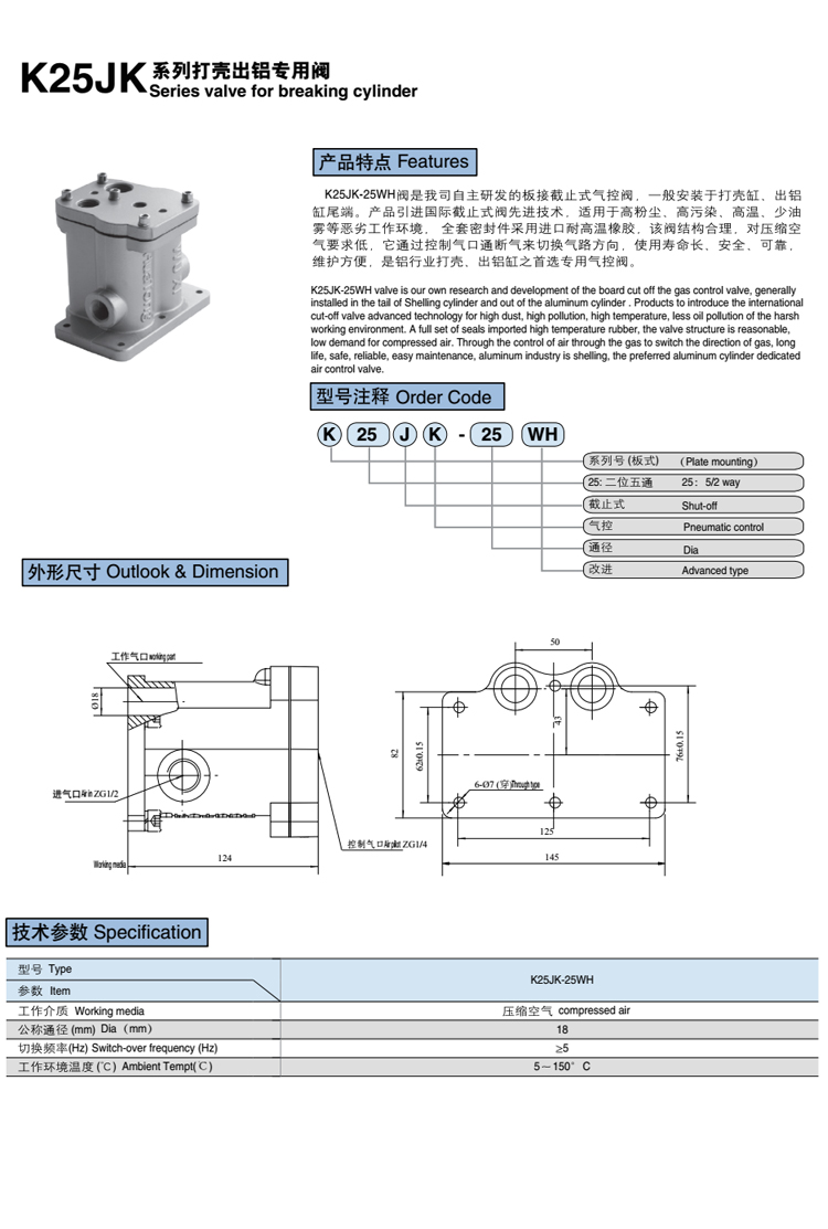 K25JK 系列打殼出鋁專用閥產品特點: K25JK-25WH閥是我司自主研發的板接截止式氣控閥,一般安裝于打殼缸、出鋁缸尾端。產品引進國際截止式閥先進技術,適用于高粉塵、高污染、高溫、少油霧等惡劣工作環境, 全套密封件采用進口耐高溫橡膠,該閥結