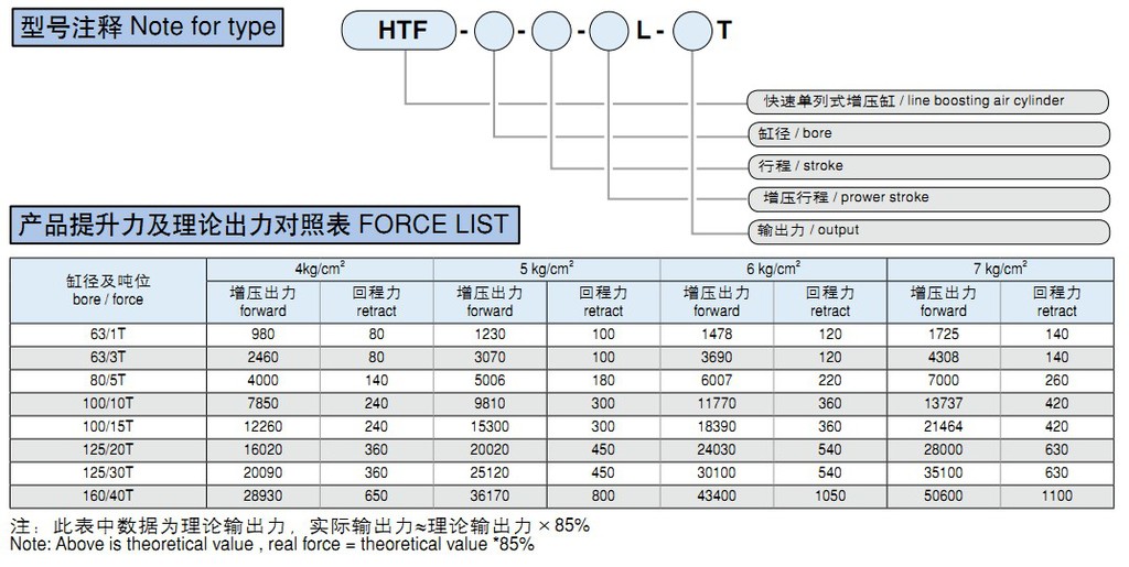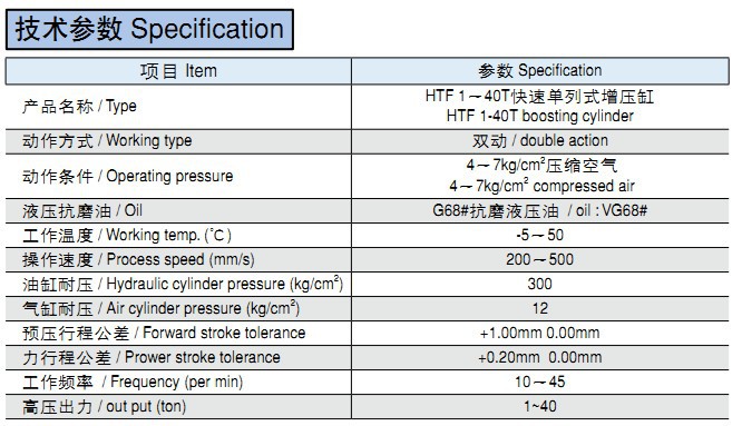 技術(shù)參數(shù) Specification項(xiàng)目 Item 參數(shù) Specification產(chǎn)品名稱 / TypeHTF 1~40T快速單列式增壓缸HTF 1-40T boosting cylinder&l