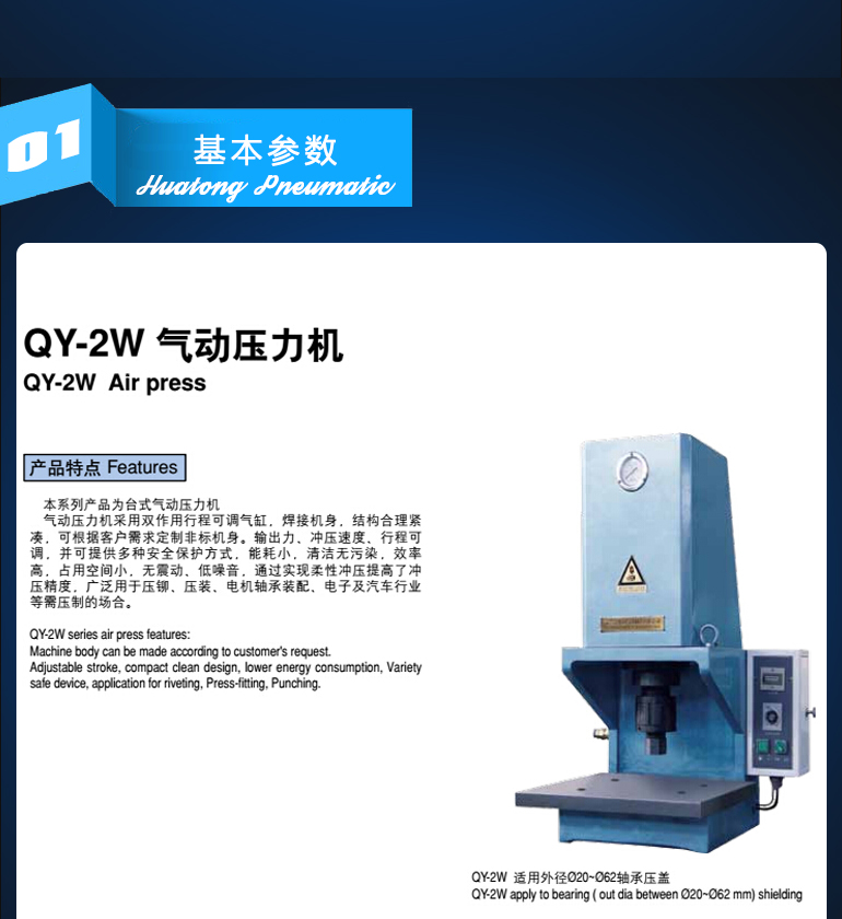 氣動壓力機/氣動沖床采用雙作用行程可調氣缸,焊接機身,結構合理緊湊,可根據客戶需求定制非標機身。輸出力、沖壓速度、行程可調,并可提供多種安全保護方式,能耗小,清潔無污染,效率高,占用空間小,無震動、低噪音,通過實現柔性沖壓提高了沖壓精度,廣泛用于壓鉚、壓裝、電機軸承裝配、電子及汽車行業等需壓制的場合。