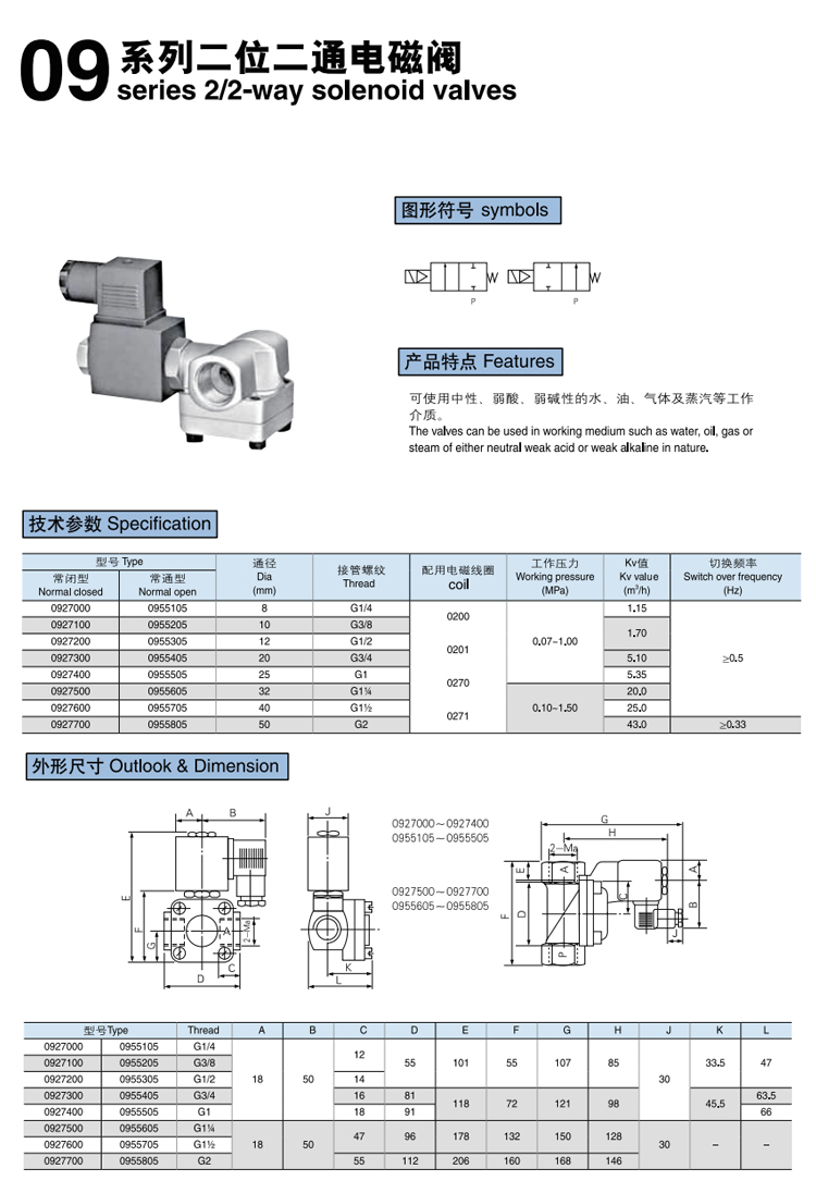 09系列 二位三通電磁閥 產(chǎn)品特點 可使用中性、弱酸、弱堿性的水、油、氣體及蒸汽等工作介質(zhì)。