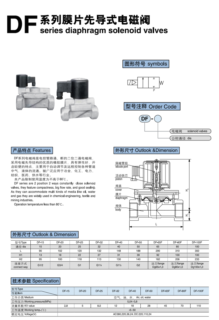 DF系列 膜片先導(dǎo)式電磁閥 產(chǎn)品特點(diǎn) DF系列電磁閥是電控管路通、斷的二位二通電磁閥,采用電磁先導(dǎo)結(jié)構(gòu)的優(yōu)質(zhì)的橡膠膜片,具有彈性好,開啟輕便的特點(diǎn),主要用于自動(dòng)調(diào)節(jié)及遠(yuǎn)程控制各種管道中氣、液體的流通。被廣泛應(yīng)用于冶