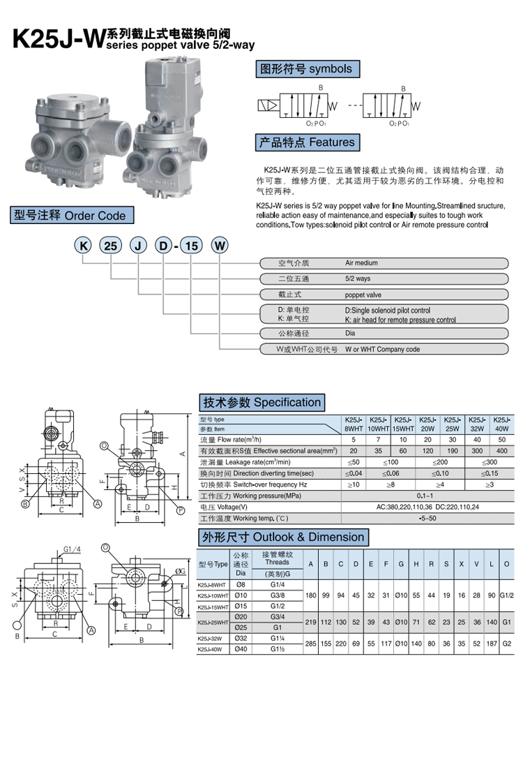 K25J-W系列 二位五通管接截止式換向電磁閥 產(chǎn)品特點 K25J-W系列是二位五通管接截止式換向閥。該閥結(jié)構(gòu)合理,動作可靠,維修方便,尤其適用于較為惡劣的工作環(huán)境。分電控和氣控兩種。