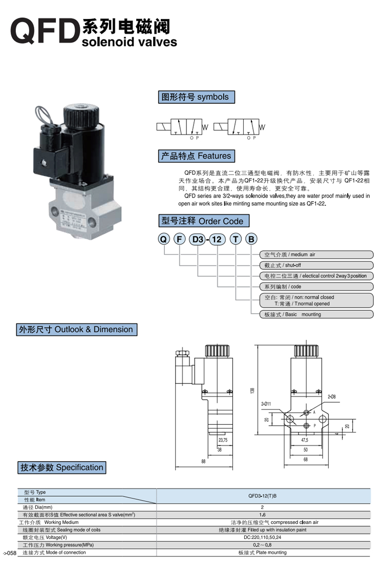QFD3-12B系列 直流二位三通型電磁閥 QFD3系列是直流二位三通型電磁閥,有防水性,主要用于礦山等露天作業場合.