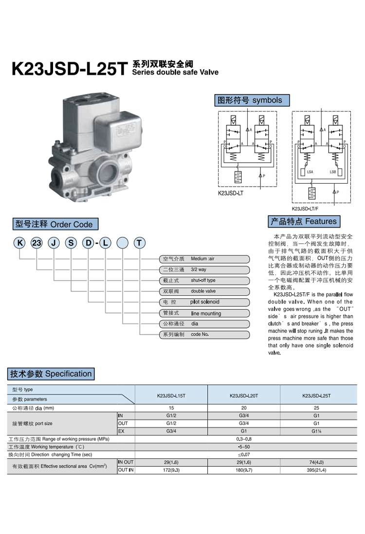 雙聯安全閥 K23JSD-L25/T系列為雙聯平列流動型(雙聯交叉流動型另選)安全控制閥,當一個閥發生故障時,由于排氣氣路的截面積大于供氣氣路的截面積,OUT側的壓力比離合器或制動器的動作壓力要低,因此沖壓機不動作。比單用一個電磁閥配置于沖壓機械的安全系數高。